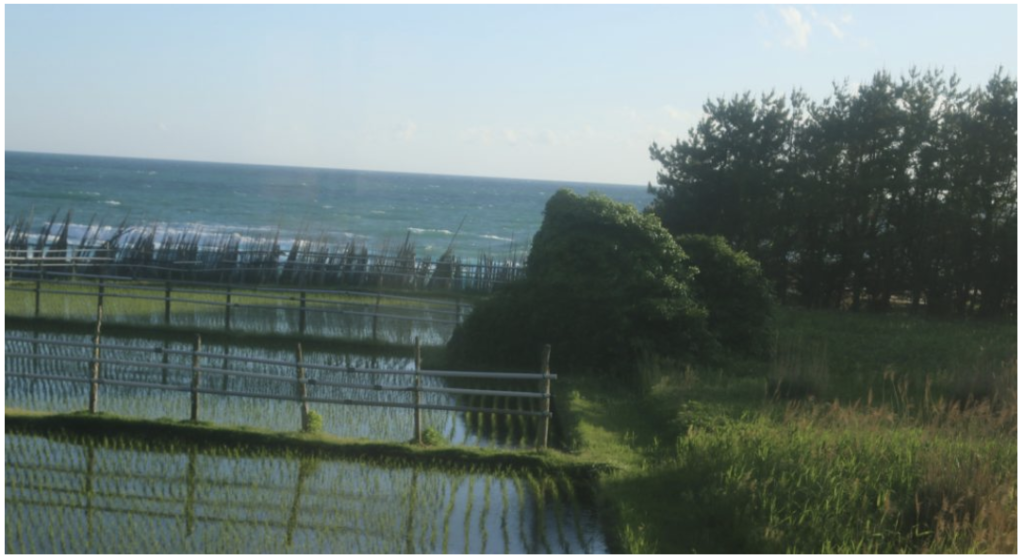 五能線は、秋田から青森へ続く海岸線を、日本海を左に見ながら走っていきます。わたしが乗った電車は各駅停車だったので、人はほとんどいませんでした。窓をあけて風をあびながら、木々や家々が通り過ぎていくのを眺めました。遠くに見えていた海は、時々ぐんと近付いてきて、また離れていきました。