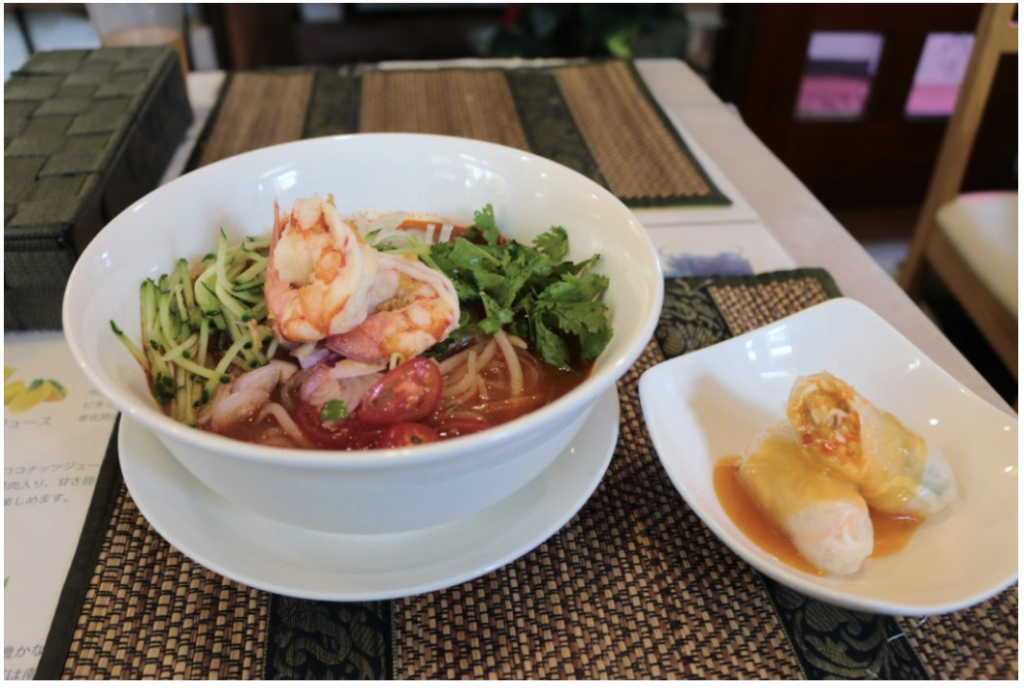 トムヤム冷麺をたのむと、「パクチーは大丈夫?」と聞かれました。待っていると、生春巻きが出てきました。トムヤム冷麺には、キュウリや海老がのっていました。スープは甘酸っぱくて、少し辛かったです。