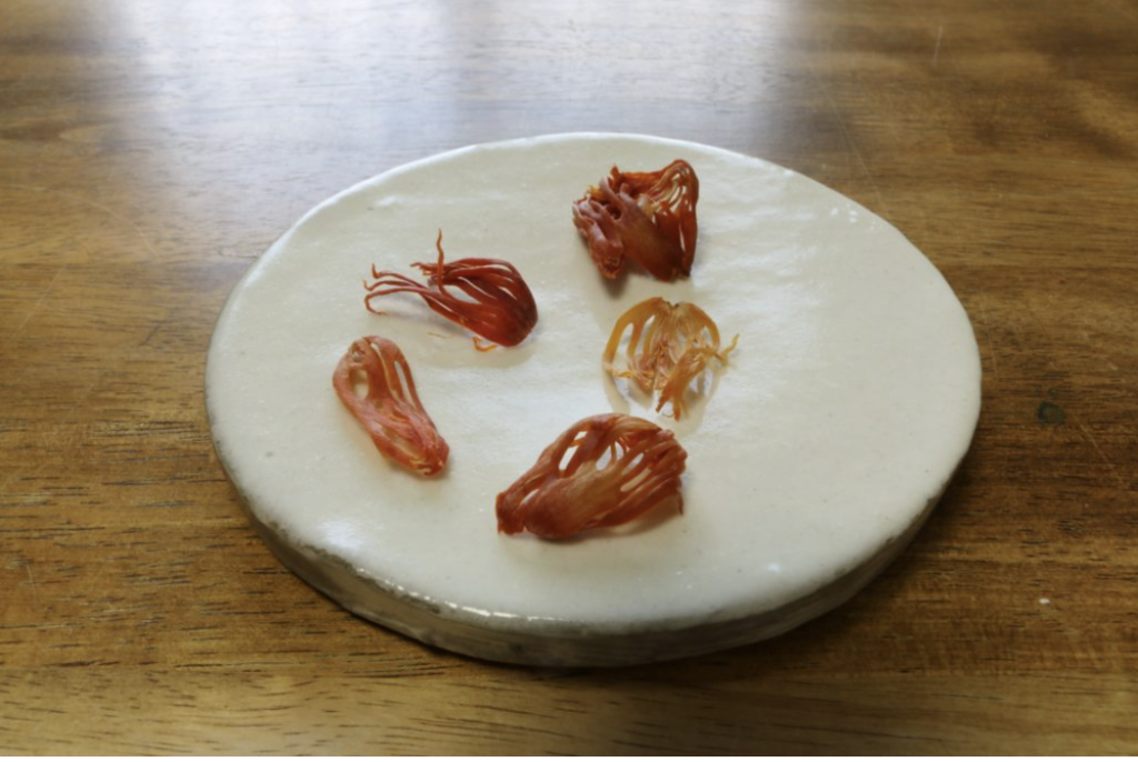 メースはナツメグと同じで、ニクズキの果実からとれます。ニクズキの果実は黄色っぽいアンズのような実で、中心の種を赤い網目状のものが包んでいます。これがメースです(種の内側にある核が、ナツメグです)。メースを種からはがして乾燥させると、鮮やかな赤い色がだいだい色に変わっていきます。メースはナツメグの10分の1の量しか収穫できないので、ナツメグより高価です。