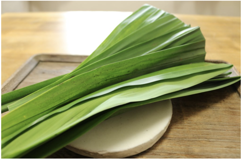 この葉をパンダンリーフと呼びます。刈りたての草の香り、花のような香りがし、バニラのような甘い風味を持っています。料理や菓子によく使われますが、葉そのものを食べることはなく、香りや色だけを利用します。
